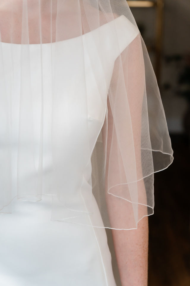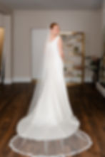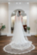 A stunning pencil edge veil, lavishly adorned with intricate lace along the train, featuring a hidden heart detail at its centre for a subtle, romantic touch.